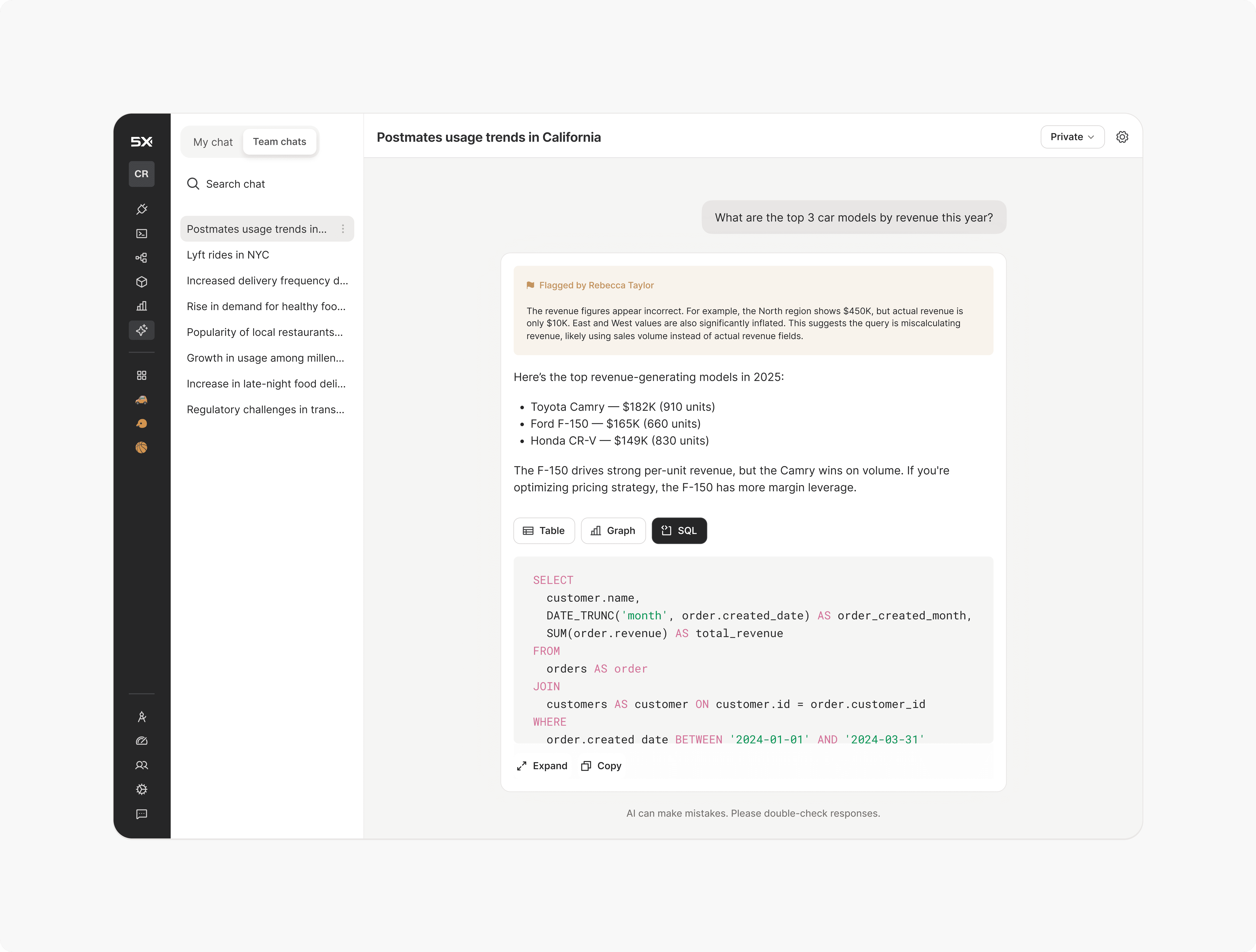 Each answer is a query, so the table, graph, or SQL can be extracted at the chat level
